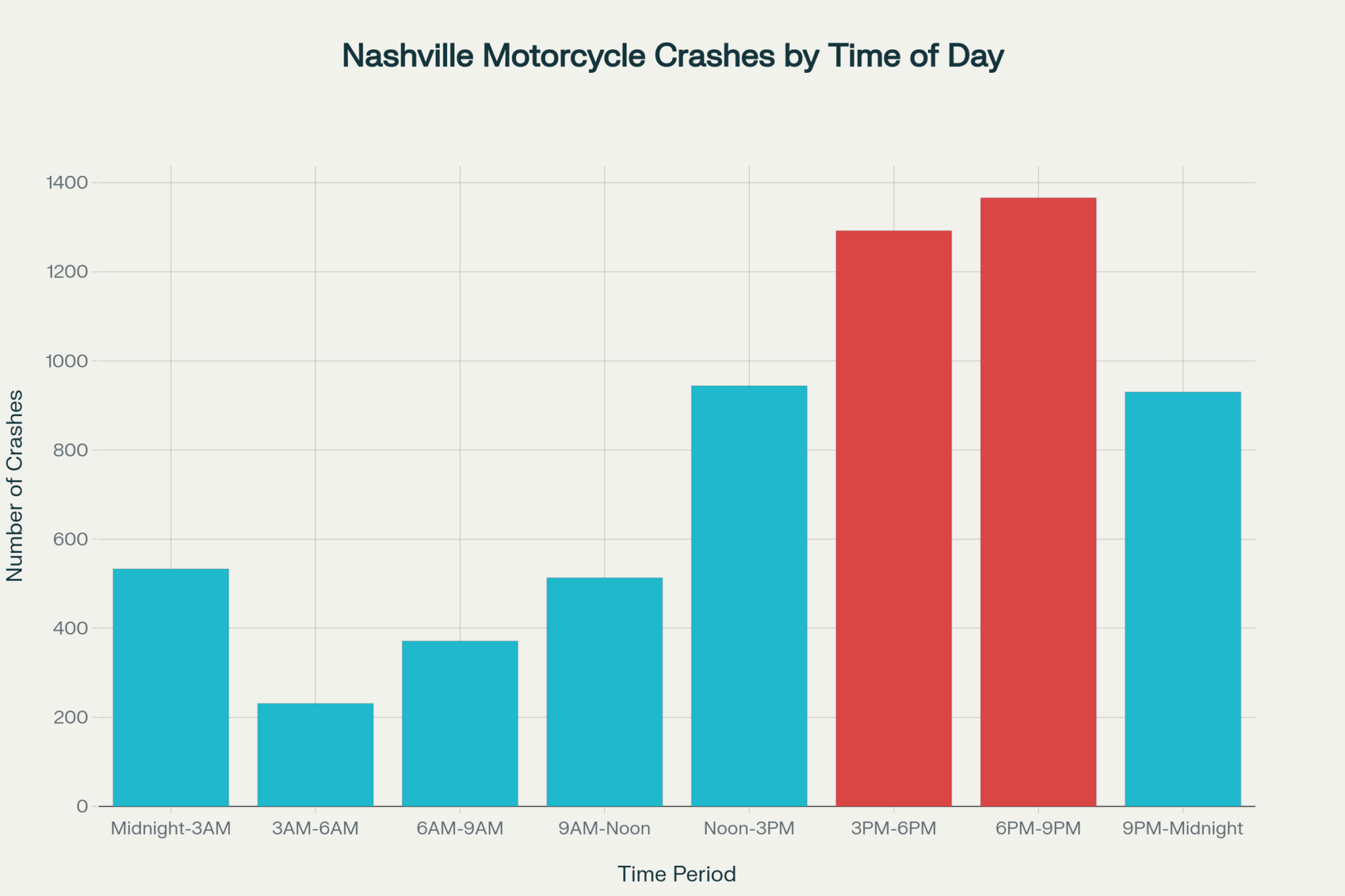 Los accidentes de moto de Nashville siguen patrones temporales distintos. El periodo de tiempo más peligroso ocurre entre las 3:00 PM y las 21:00 PM, con un 42% de todas las víctimas de la motocicleta [10]. El sábado emerge como el día más peligroso, mientras que septiembre representa el mes máximo para los accidentes.